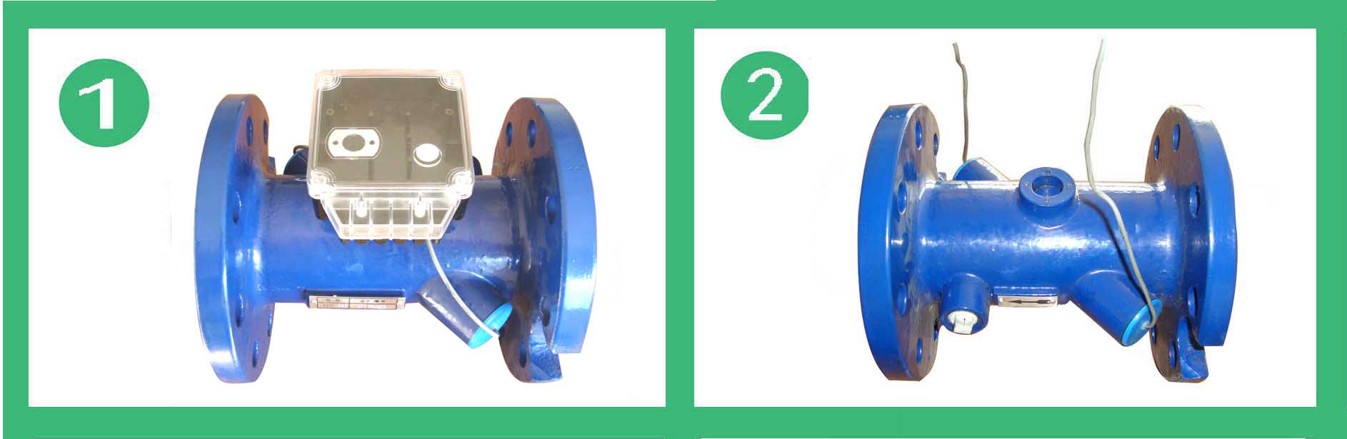 b.樓棟型熱量表超(chāo)聲波流量計由表殼、換能器、換能器座組成。順流方向和逆流方向,換能器1或(huò)換能(néng)器2發(fā)射的超聲波信號由換能器2或換(huàn)能器1接收(shōu)。