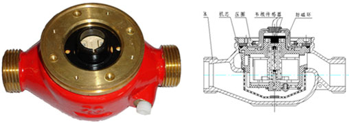 DS97TAR多流束有磁(cí)熱量表流量計的結構如圖,其工作原理(lǐ)是:熱水進入流量計(jì),經進水導向孔衝擊計量腔內的葉輪旋轉,再經(jīng)出水導向孔流出流量計。葉輪上麵嵌有(yǒu)磁鋼隨葉輪旋轉,在隔板上端的韋根遠傳組件,接受葉輪旋轉的周期信號。其殼體采用優質黃銅,經鑄造、數控機床和組合機床加工,機械強度好、尺寸(cùn)精度穩(wěn)定一致,塑料零件選用進口(kǒu)的高強度(dù)耐熱(rè)工程塑料,密封件采用優質耐熱材(cái)料。因此(cǐ),該流量計完全(quán)能夠適應(yīng)國內供熱係統(tǒng)的惡劣工作環境。