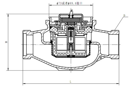 DS97TAR多流束有(yǒu)磁熱(rè)量表流量計的結(jié)構如圖,其工作原理是:熱水進入流量(liàng)計,經進水導向孔衝擊計(jì)量腔內的葉輪旋轉,再經出水導向孔流出流量計。葉輪上麵嵌有磁(cí)鋼隨葉輪旋轉,在隔板上端的韋根遠傳組件,接受葉輪旋轉的周(zhōu)期(qī)信號。其殼(ké)體采用優質黃(huáng)銅,經鑄造、數控機床和組合機床加工,機械強度好、尺寸精度穩定一致,塑料零件選(xuǎn)用進口的高強度耐熱(rè)工程塑(sù)料,密封件采用優質耐熱材料。因此,該流量計完全能夠適應(yīng)國內供熱係統的惡劣工作環境。